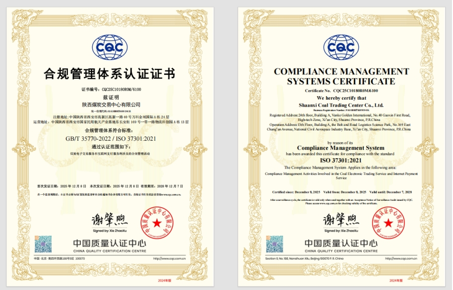 陕西煤炭交易中心:获合规管理体系认证证书